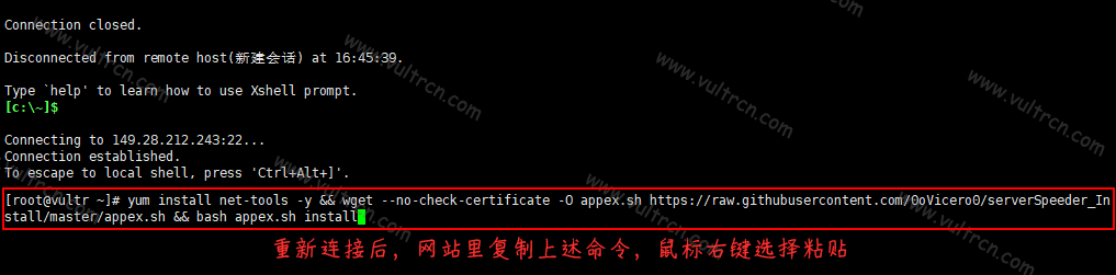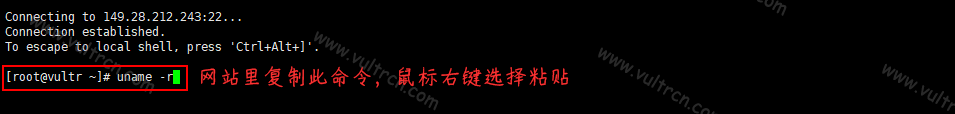 按照[《Windows 使用 Xshell 软件连接 Vultr VPS 教程》](https://www.vultrcn.com/3.html)连接好服务器。按照下图提示,我们首先复制下列命令: