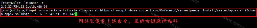 wget --no-check-certificate -O appex.sh https://raw.githubusercontent.com/0oVicero0/serverSpeeder\_Install/master/appex.sh && bash appex.sh install '2.6.32-642.el6.x86\_64'