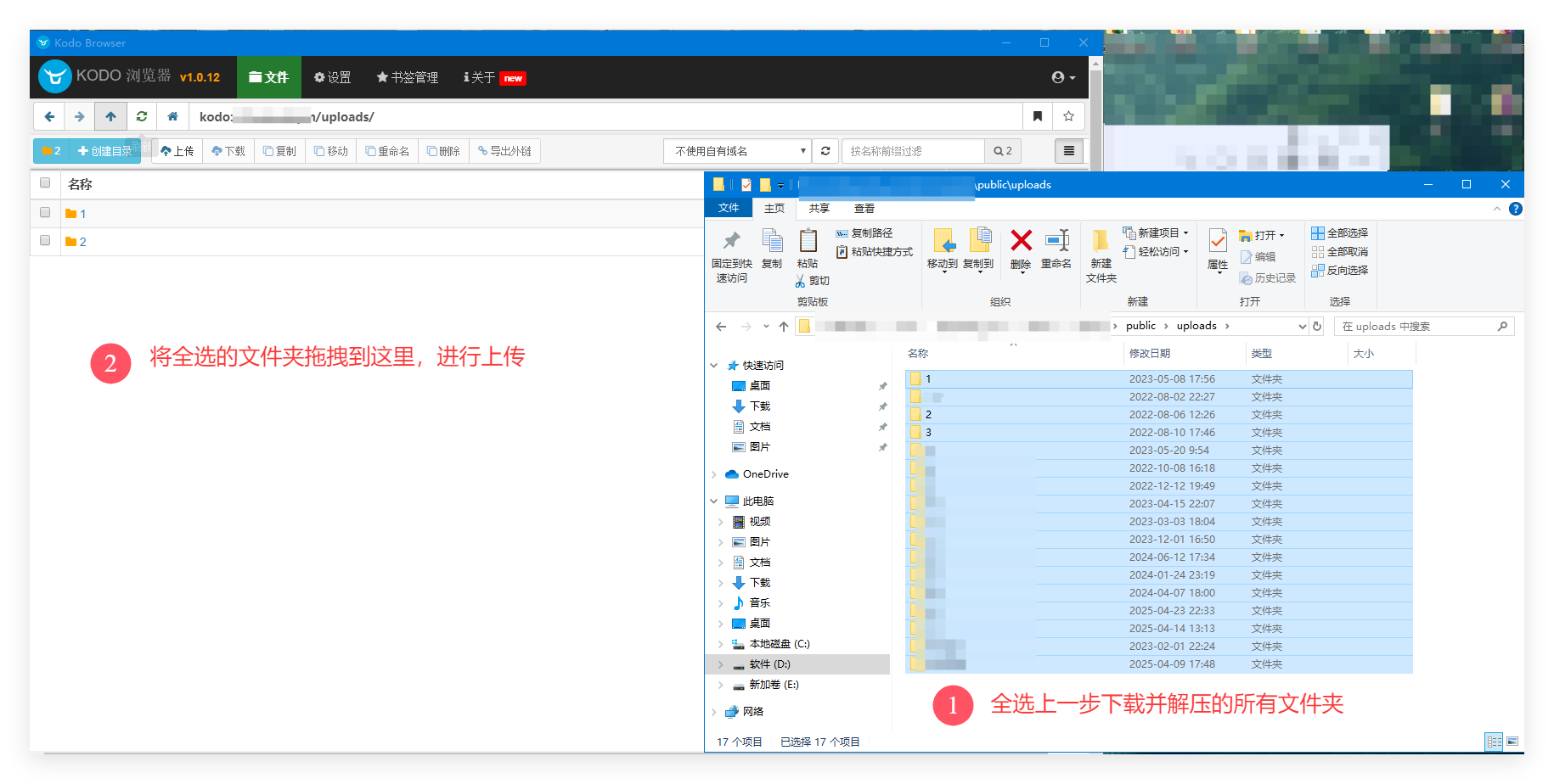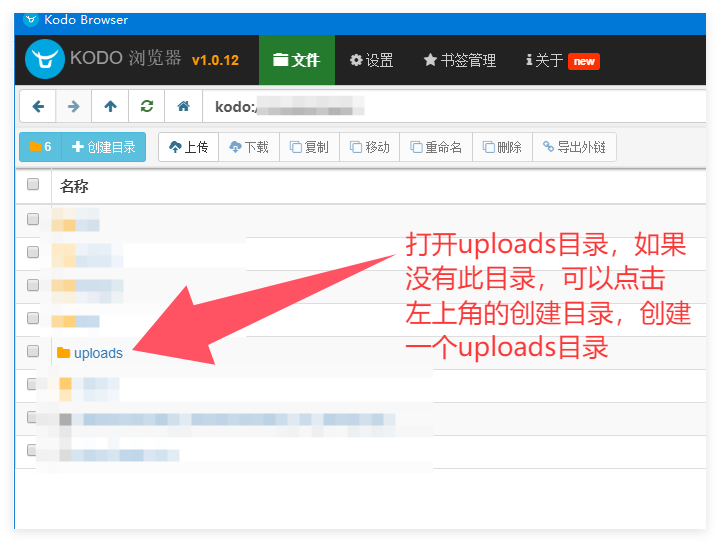 下载安装后,使用七牛云的AccessKeyId/AccessKeySecret 登陆Kodo Browser,然后在Kodo Browser里打开你的Bucket,打开uploads目录,如果没有uploads目录,你可以新建一个uploads目录,打开uploads目录,然后将上一步里下载并解压的文件夹全部选中,拖拽到Kodo Browser里,就会自动上传。