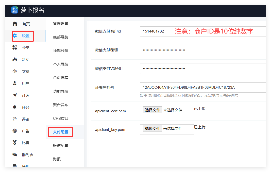 **萝卜报名后台——设置——支付配置**