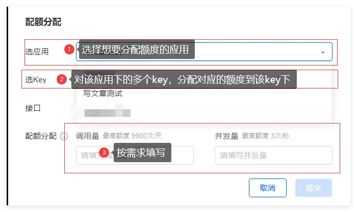 分配额度,具体怎么分配,需要根据你的实际需求来分配,例如你只用这一个KEY,不再申请key,分配量就填最大。