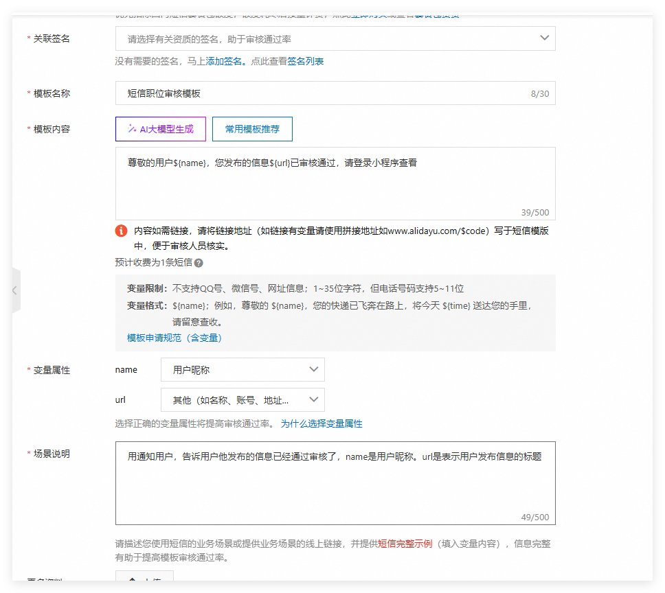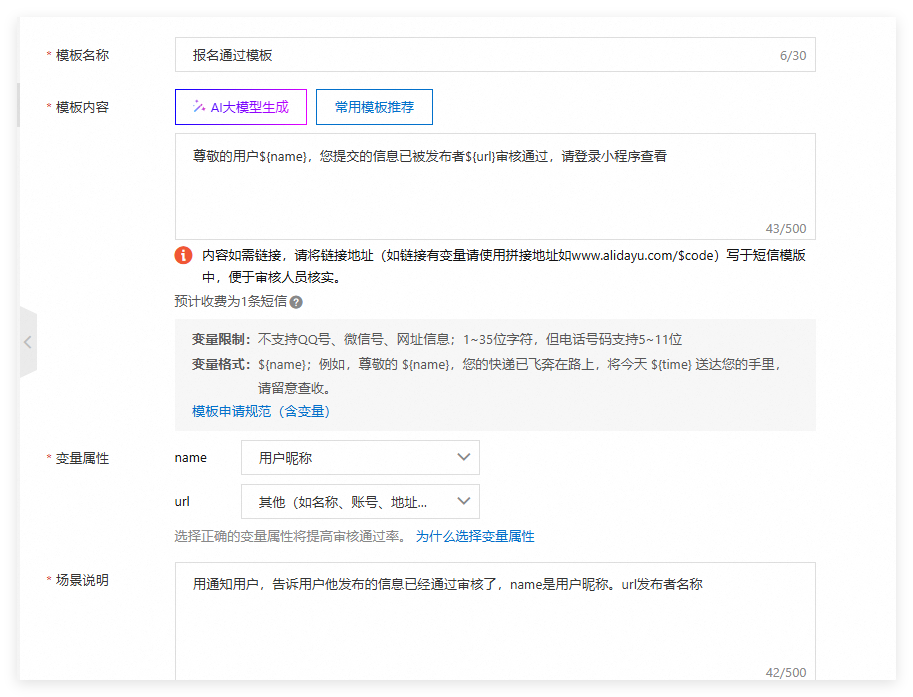 例子:尊敬的用户${name},您发布的信息${url}已审核通过,请登录小程序查看
