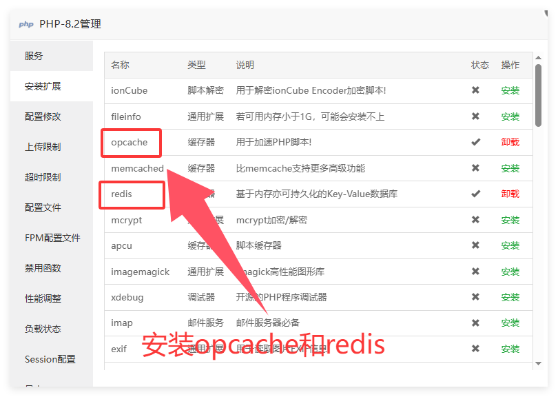 php拓展 opcache,redis(可在宝塔后台一键安装),