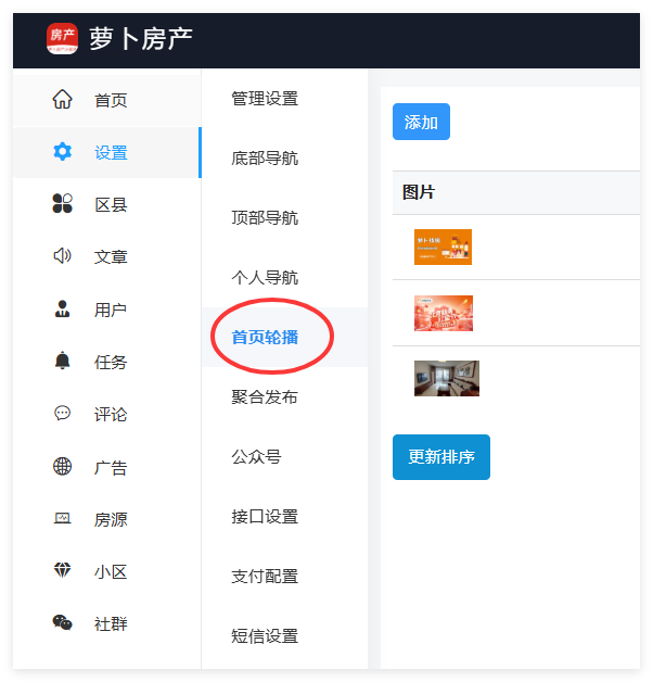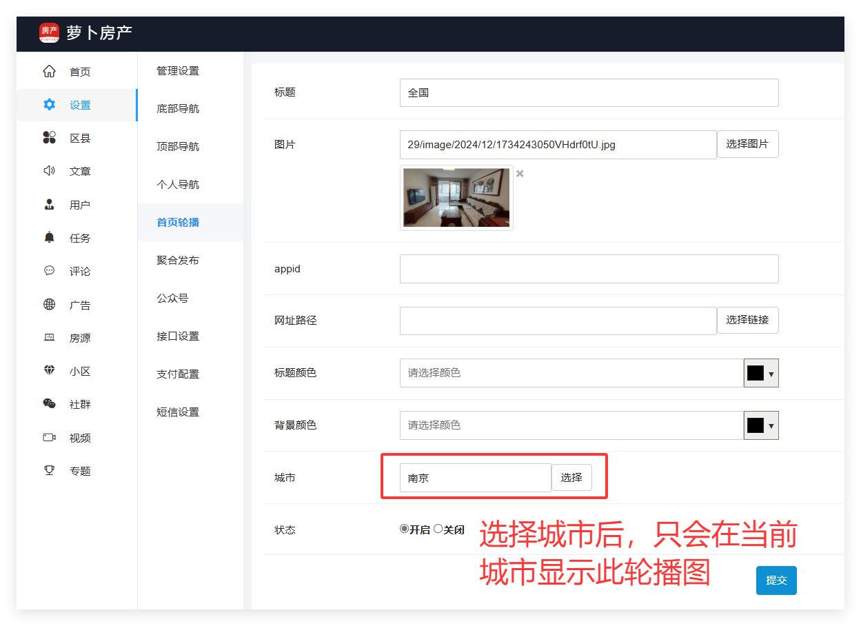 添加首页轮播图  关于城市设置:  留空则在全部城市显示