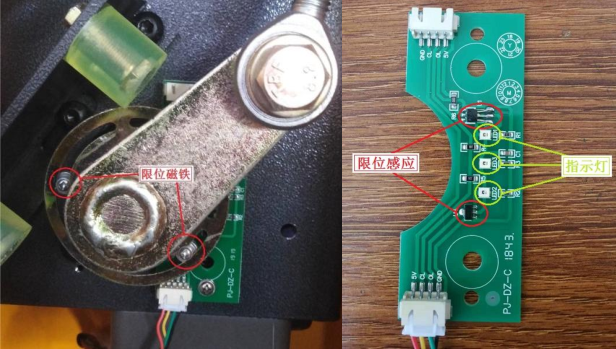 > 如果出厂道闸杆角度不符合实际项目需求,可通过调节限位器磁铁位置来调节道闸杆角度,如下图: