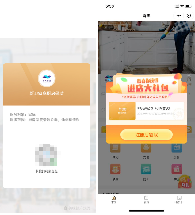Step4:顾客扫码后可进入新卫保洁的小程序网店,同时可以领取一张首次体验券,以88元的低价即可享受一次专业的家庭厨房深度保洁服务。各渠道每给新卫保洁带来一个消费满88元的客户,即可获得佣金18元,每个月初结算。