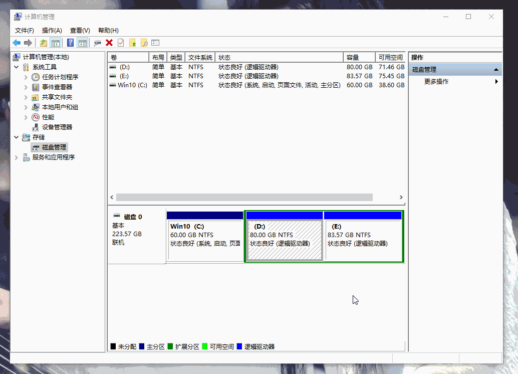 ## 4.0 合并盘,把新分出的f盘再合并到d盘,注意:从d盘分出的,只能合并到d盘,子级只能合并到父级,不能合并到爷爷级