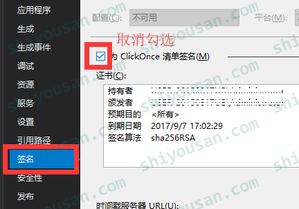 4、 取消[“为ClickOnce清单签名”](https://msdn.microsoft.com/zh-cn/library/zfz60ccf(v=vs.90.aspx))勾选。