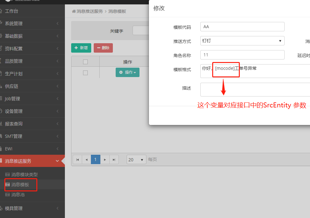 SrcEntity:模板变量键值对,这里必须是json格式,这个字段可不填,单填了必须是json序列化格式