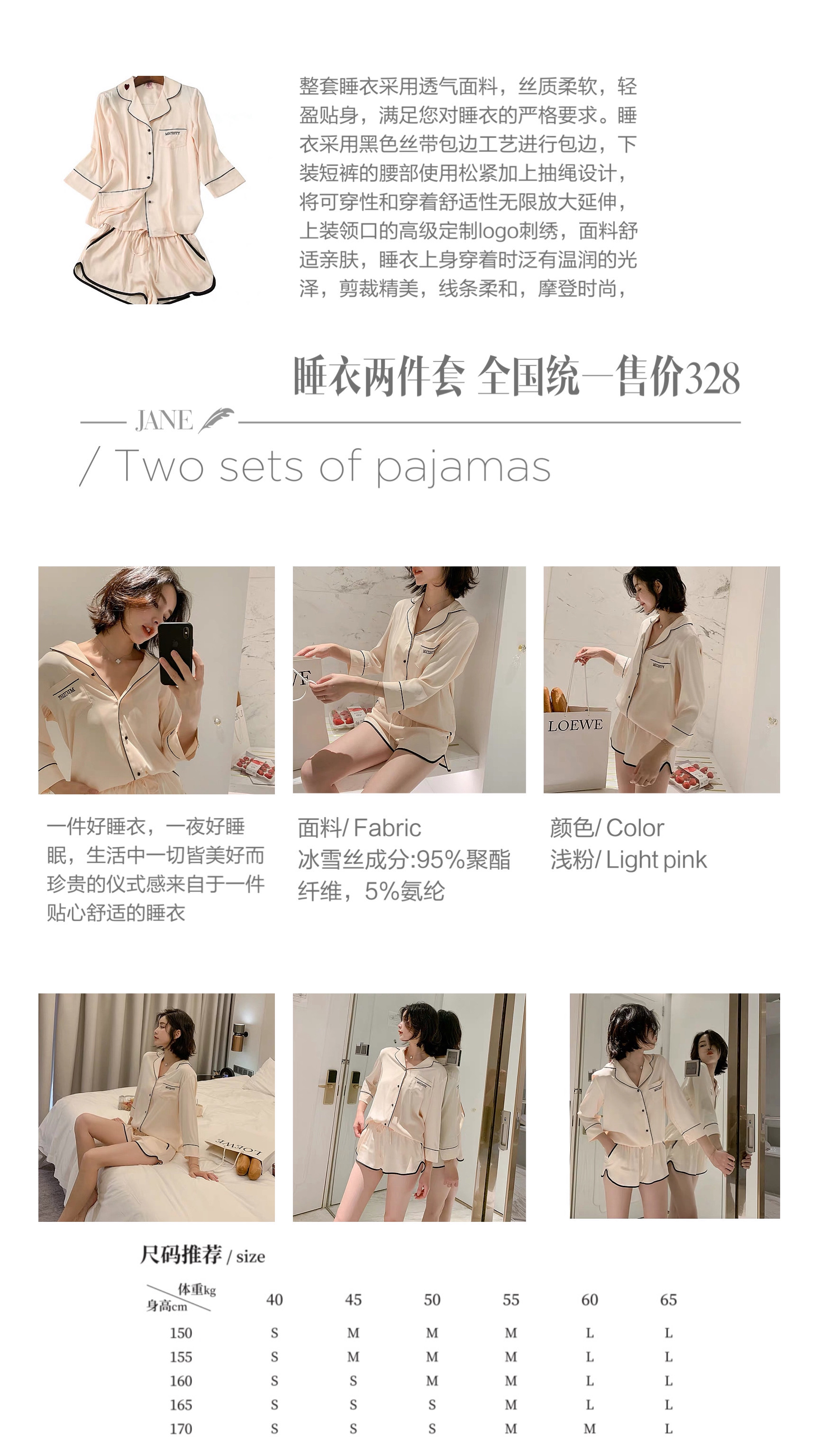 * [ ] 睡衣两件套:S、M、L,冰雪丝材质,丝滑感受,非常舒适,七分袖配小短裤,盛夏季节适合,清楚活力