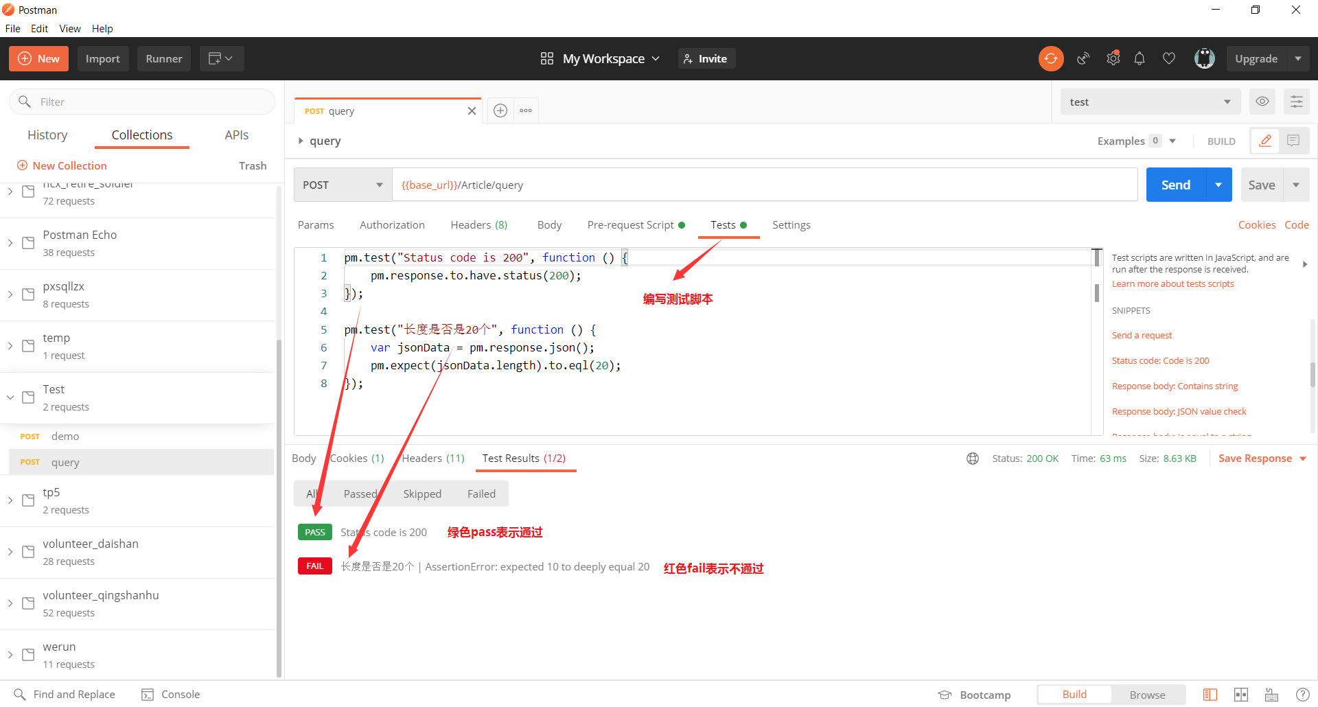 `Postman`的断言实际上就是往全局对象`tests`添加键值对。它的`key`会显示在报告界面上,`value`是可以解析为`boolean`的表达式。如果得出的值是true,在报告里就会显示为成功,`false`失败。