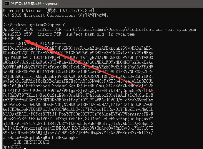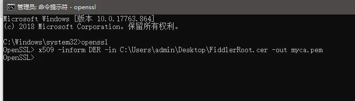 运行 x509 -inform DER -in C:\Users\admin\Desktop\FiddlerRoot.cer -out myca.pem