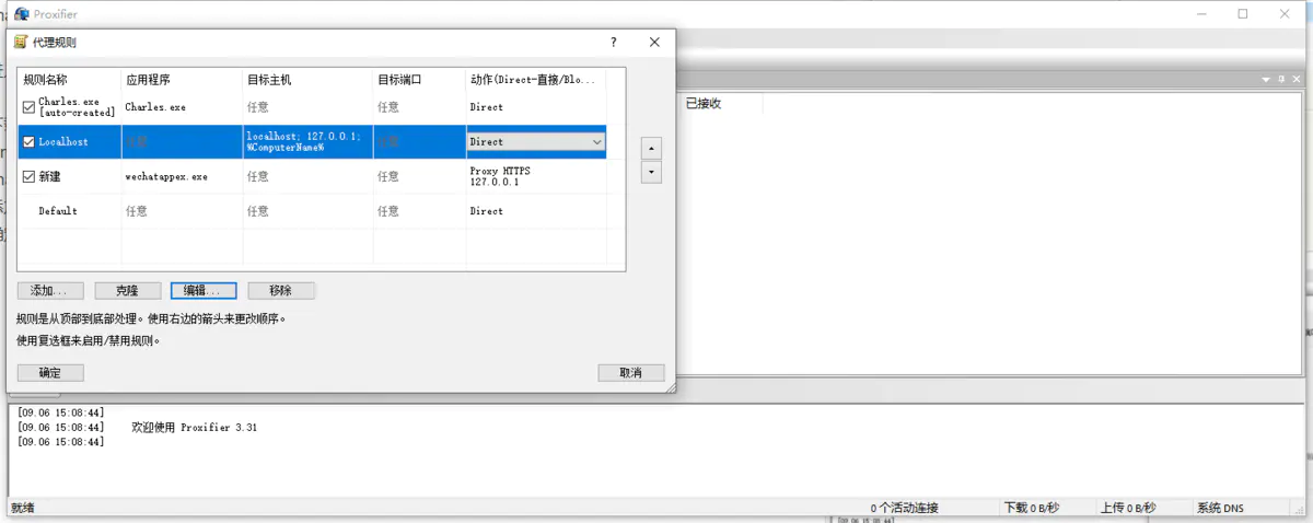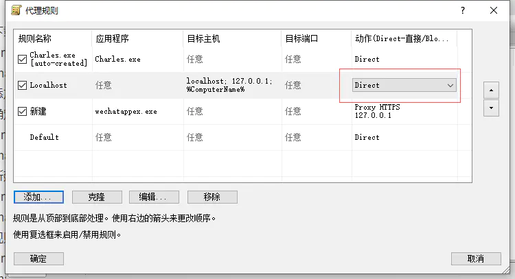 除了刚刚添加的规则,其他全部设置为Direct,然后点确定,重启微信,即可正常抓包