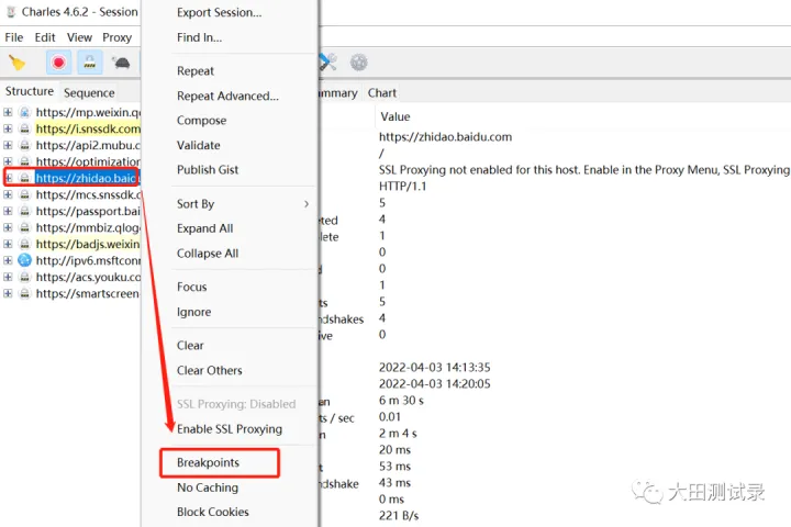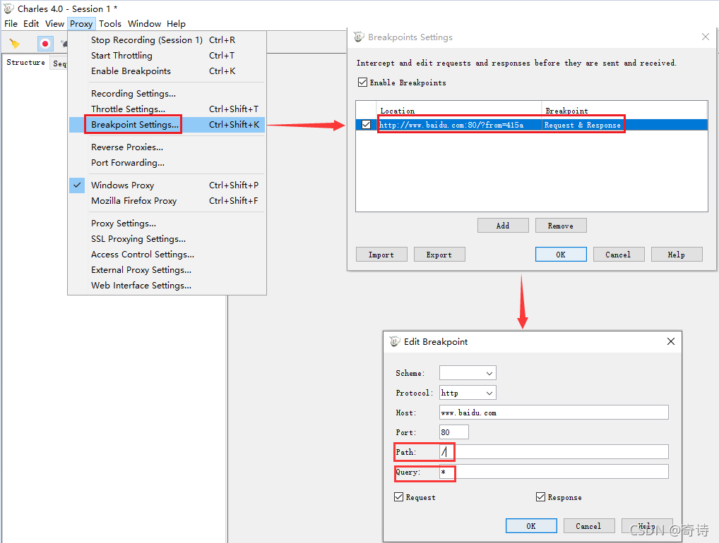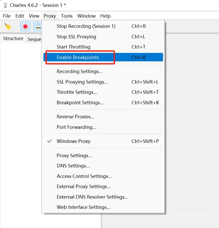 菜单栏Proxy -> EnableBreakpoints开启断点