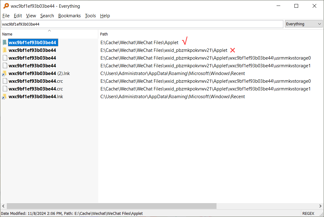 2. Everything搜索小程序包路径(有两个目录,不是微信id下的Applet目录)