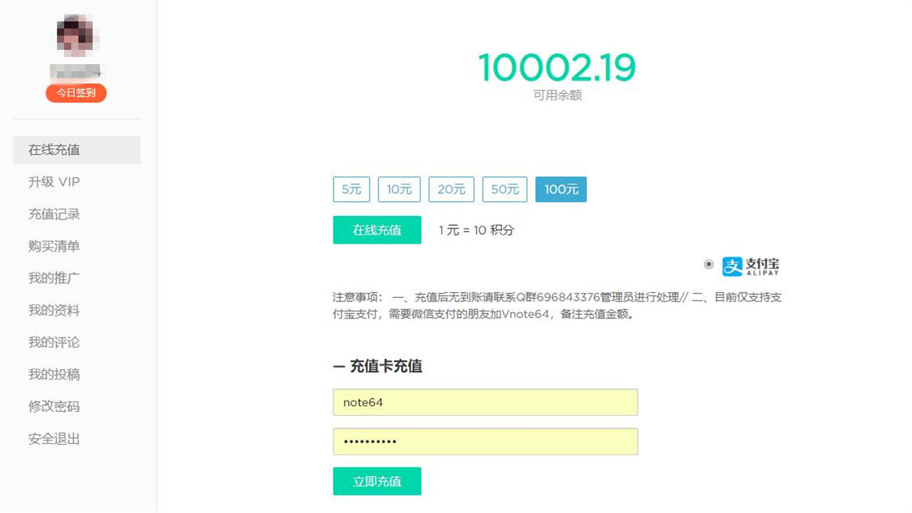 进入**会员中心**\http://note64.xyz/user -充值积分。