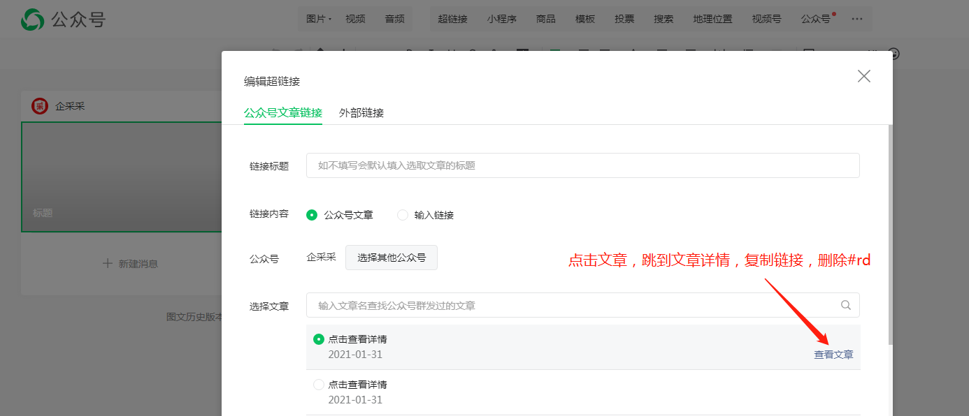 **步骤二:**再次打开公众号图文素材,添加一篇文章,直接点击【超链接】,找到刚才群发的文章,不要点击,将鼠标放在标题上时,右侧出现“查看文章”按钮,点击此按钮,打开文章页面,从浏览器地址栏复制链接。链接格式为:https://mp.weixin.qq.com/s?__biz=MzI2MDAzOTQyMw==&mid=2247485440&idx=1&sn=5abb9a2faa85c477ccd2b17e7eac08a1&chksm=ea6eff90dd1976864b1d8384b579789a20991afdda02bbe65fbdb5be18f15b82b6f7ec5a5b38&token=1166050226&lang=zh_CN#rd,