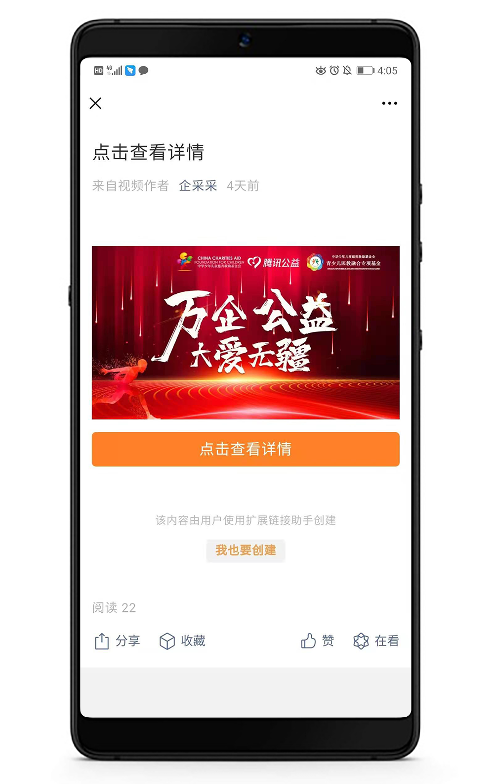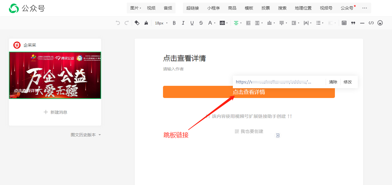 步骤一:到公众号后台图文素材中,编辑一篇图文,内容为一个按钮,文字为:点击查看详情,并添加链接,选择外部链接,链接填写:https://wxxcx.aiweiker.com/addons/gf\_videolink/wxbridge.php