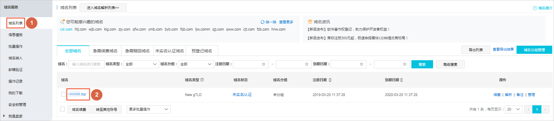 1. 登录[阿里云域名控制台](https://netcn.console.aliyun.com/core/domain/list)。