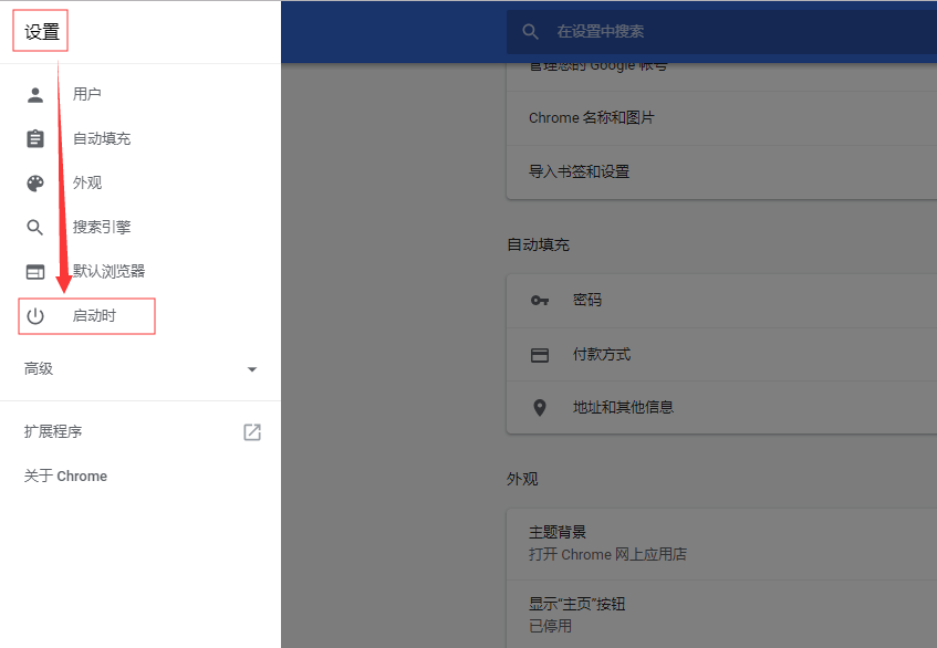 **2. 进入设置窗口,先点击左上角“设置”,进入菜单再选择“启动时”:**