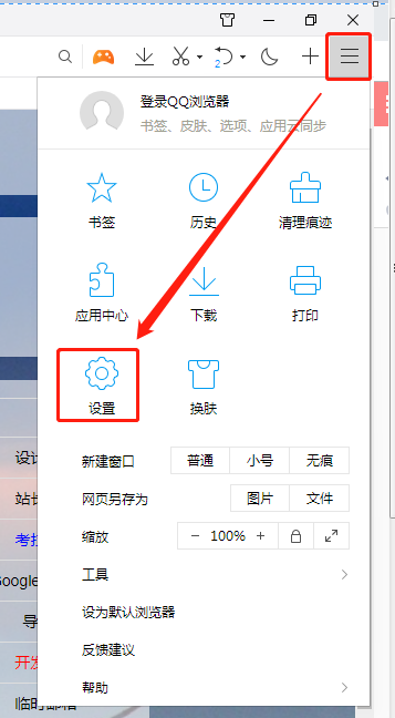 **2. 进入QQ浏览器菜单窗口,选中:设置:**