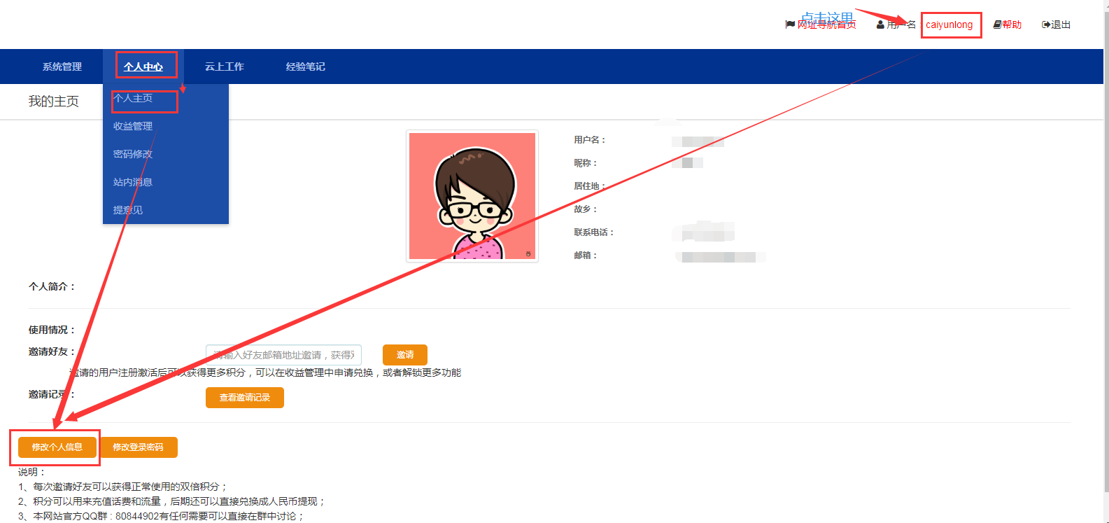 1、点击菜单栏个人中心》个人主页,或者直接点击右上角用户名进入个人主页,如下图: