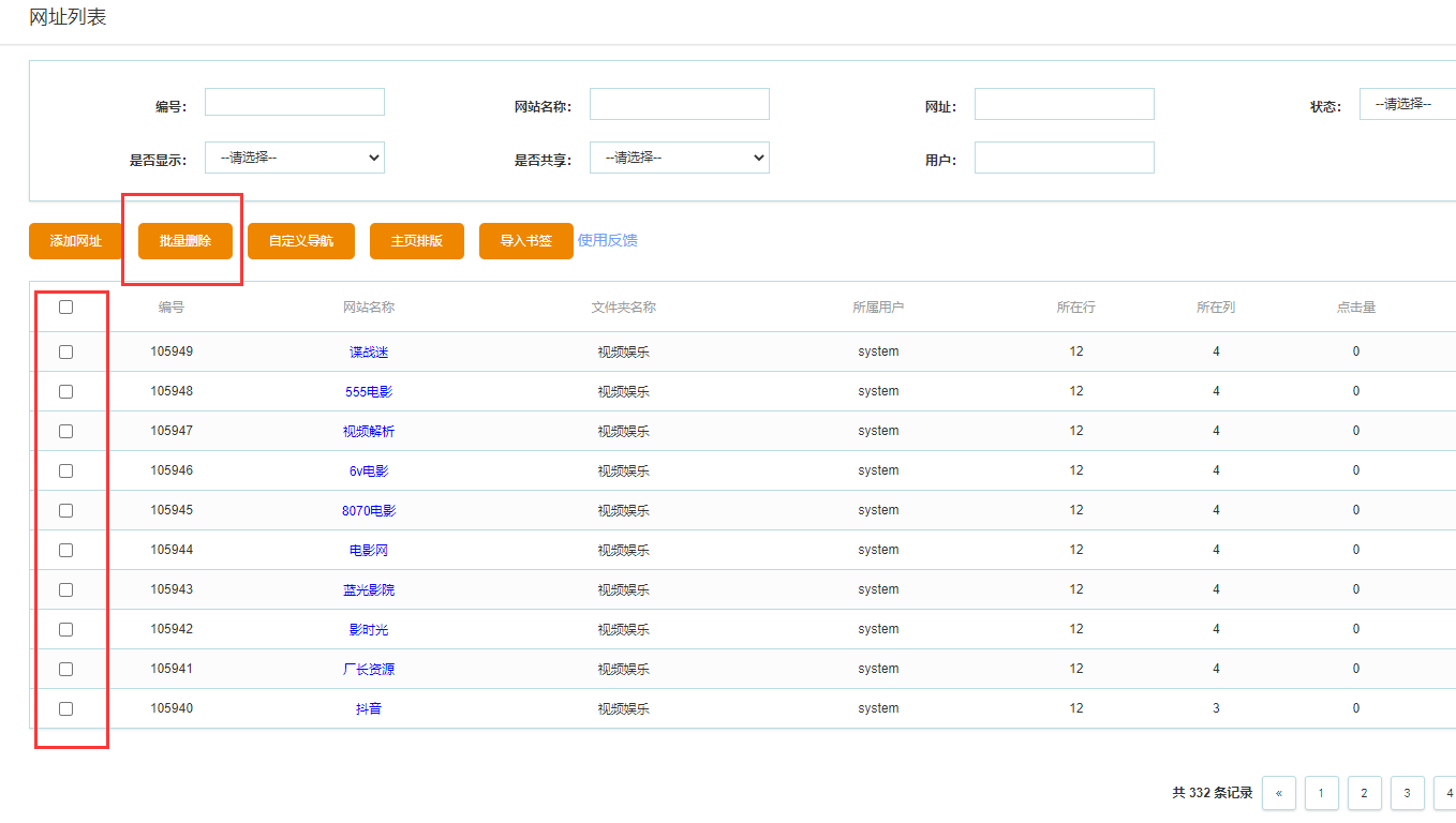 在列表页面选中需要删除的网址前面的复选框,再点击上面的批量删除按钮,即可批量删除选中的多个网址。