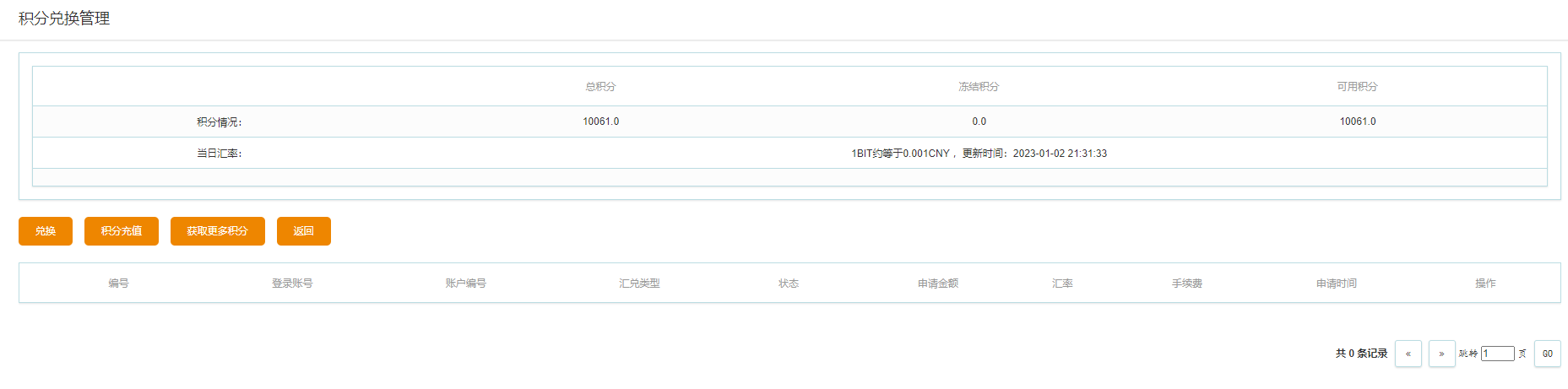 1、用户访问[www.onekbit.com](https://www.onekbit.com/) 进入管理后台选择:个人中心》收益管理》积分兑换》即可进入管理列表页面: