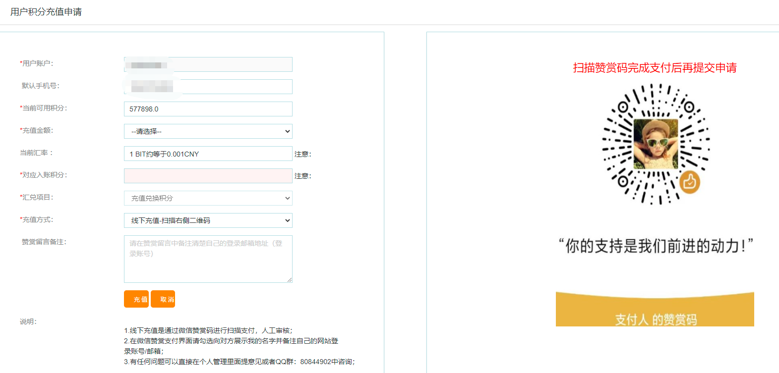 3、选择需要充值的积分数量,后按提示扫描右侧的二维码付款,付款完成后点击提交