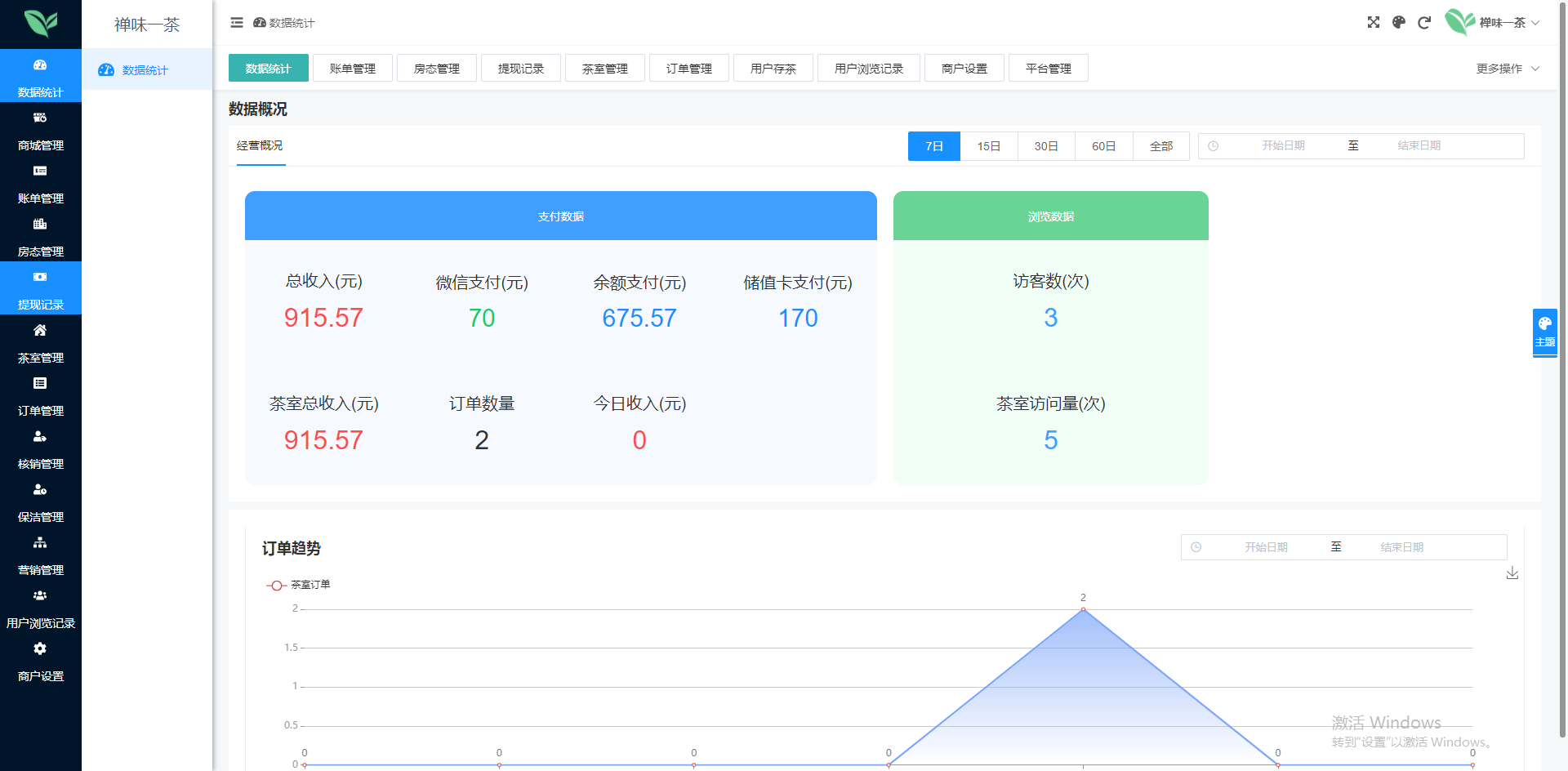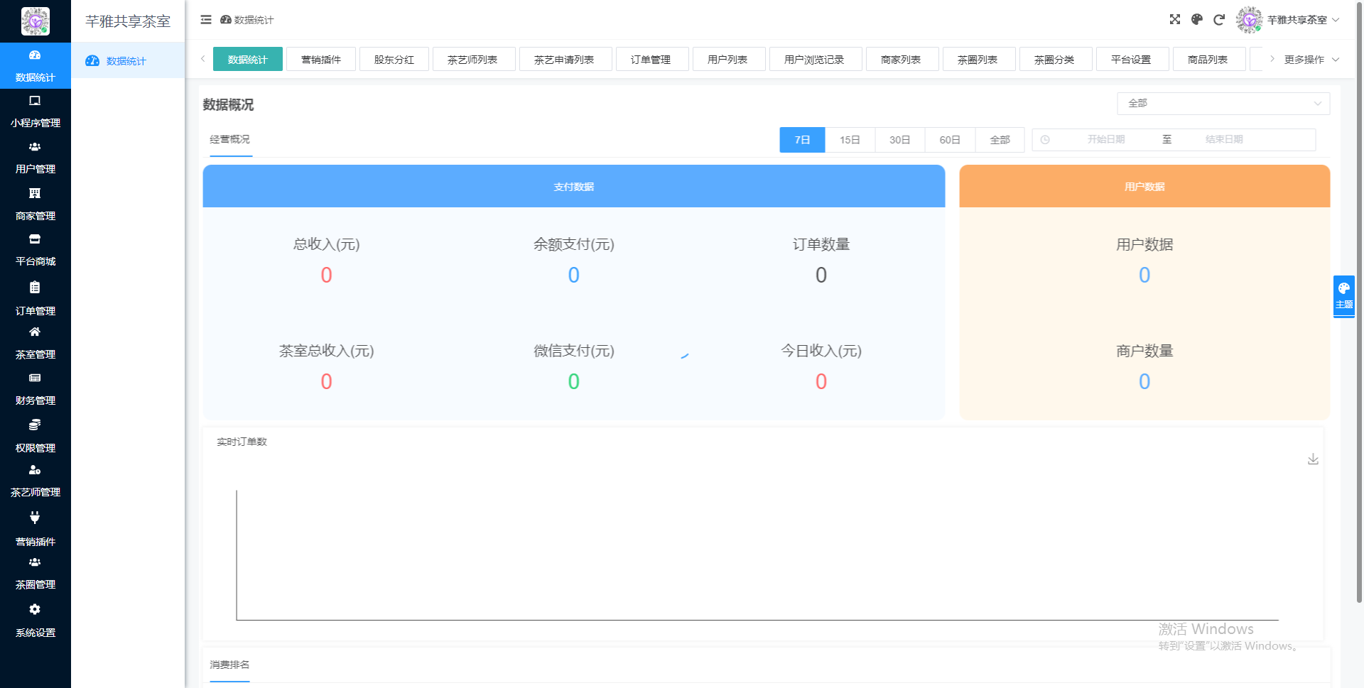 #### 2、数据统计(用户数据、账单数据、茶室订单数据等);