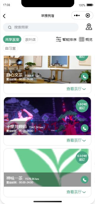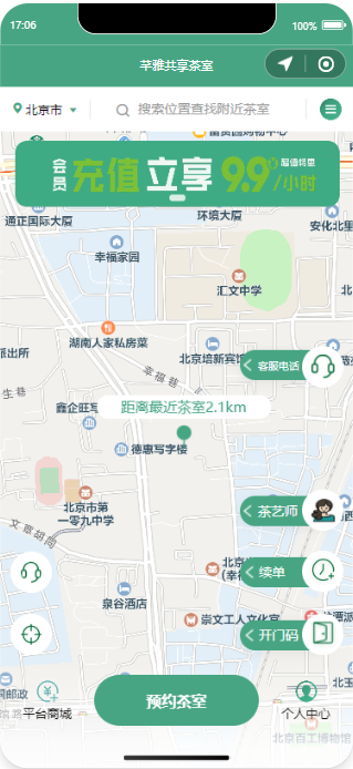 ## *小程序端用户可查看地图附近的茶室,选择预约时间下单。