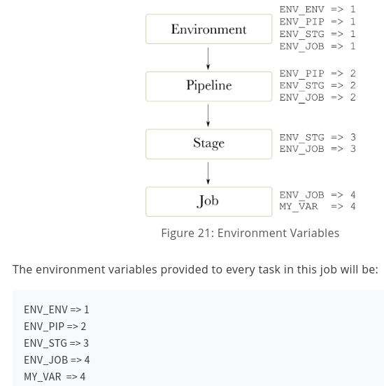 可以在多个级别上定义环境变量:在环境内,管道内,阶段内和作业内。它们遵循级联系统,其中在“环境”级别定义的环境变量被在管道级别定义的环境变量覆盖,依此类推。