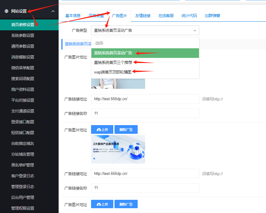 > 网站设置→首页装修设置→广告图片