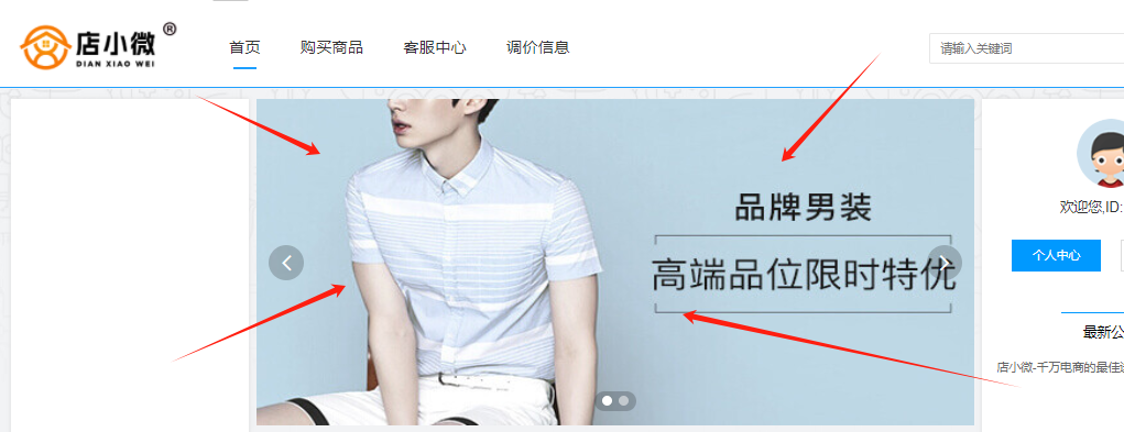 > 电脑端店铺首页的中间这一张图片就是轮播图滚动广告。在这里可以上传自己已经做好的广告图片,总共可以上传四张,如果只上传一张,就只有单张显示,如果上传超过一张,图片就会轮流播放