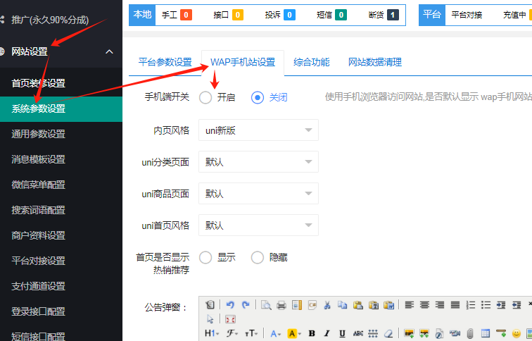 手机端也称之为AWP端。该页面有手机端风格开关,店铺首页风格选择。店铺分类页面风格选择,店铺商品详情页面风格选择,每个页面都可以自己测试选择自己喜欢的风格,手机端风格如果关闭的话,风格会随电脑端的样式来显示,而不会单独显示。