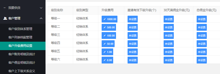 > 第三操作列:30天满佣金升级,代表用户30天内达到该佣金条件,将会自动升级到该等级。佣金由邀请新用户获得,0代表不开启该自动升级的条件设置。