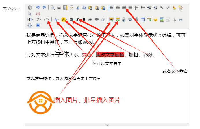 编辑器的常用功能,本文已经用箭头标注出来。可以从其他地方直接复制过来。像淘宝的商品详情都以图片显示,就直接插入图片就可以了,具体效果可到店铺首页去测试。