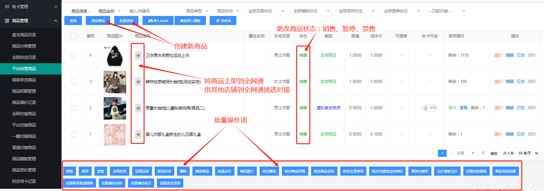 * 底部批量操作项,可批量修改商品的信息属性,如:批量设置销售状态、批量设置全网通上架状态、批量设置目录、图片、批量删除等等..