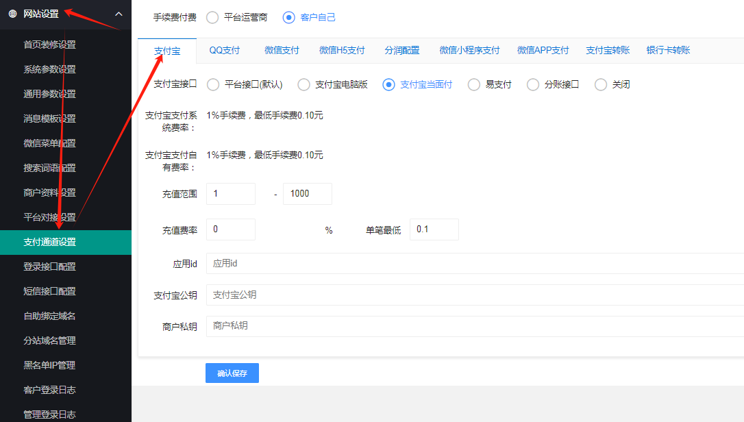 ##### 13.进入后台 设置-支付配置-支付宝-通道配置,正确填写密钥,其他项如不懂默认即可