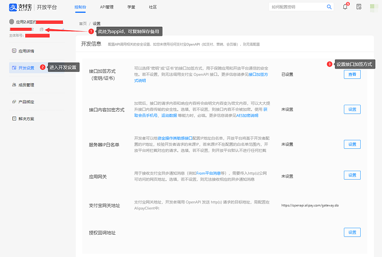 ##### 3.创建好应用或直接有基础应用的,点击详情进入配置页面,可以先复制APPID保存备用,进入开发设置,设置接口加签方式