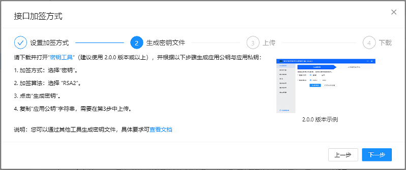 ##### 4.进入加签配置页面,加签方式选择 密钥(普遍适用) 方式即可,按步骤操作进入下一步。