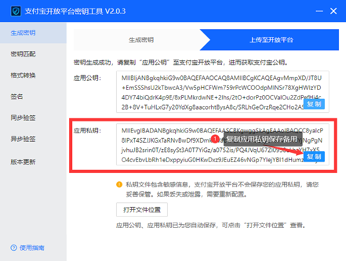 ##### 9.复制\[支付宝开放平台密钥工具\]中的 应用私钥 保存备用