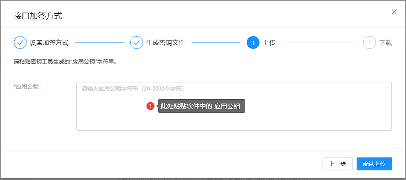 ##### 7.复制软件生成的【应用公钥】粘贴到网页中,点击网页中的确认上传按钮进入下一步