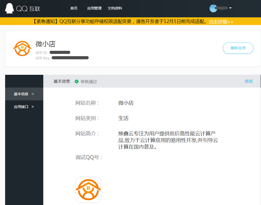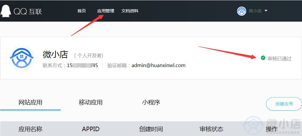 #### 1.访问并登录[QQ互联](https://connect.qq.com/ "QQ互联")网站,进入应用管理,确认开发者资料已审核通过,如果未认证的需要先申请开发者认证。
