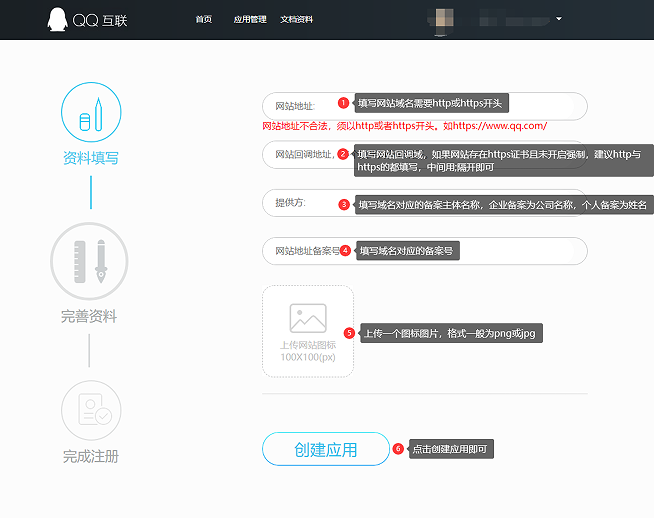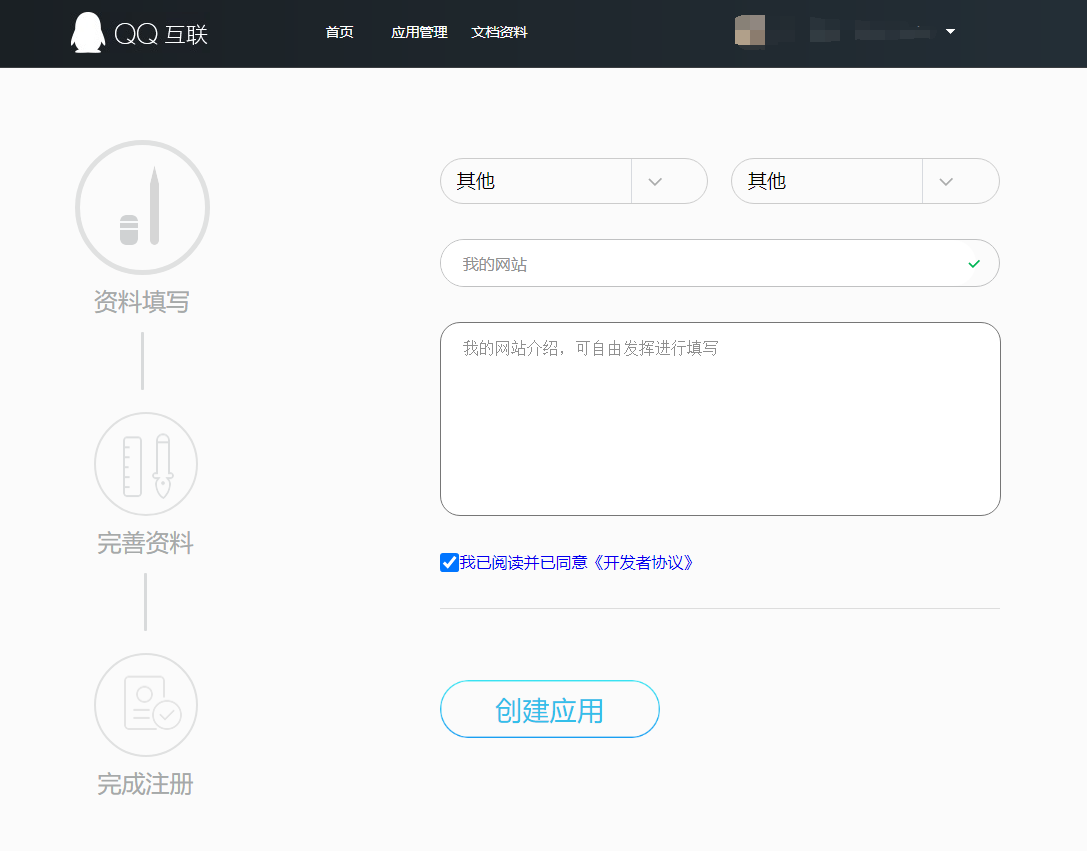 #### 2.创建应用,选择创建网站应用,应用类型可都选择 其他,网站名称及网站介绍按自己需求填写即可(一般审核网站名称需要与域名备案名称有关联更容易通过,但是有时候无关联也会审核通过,这个取决于审核人员)。
