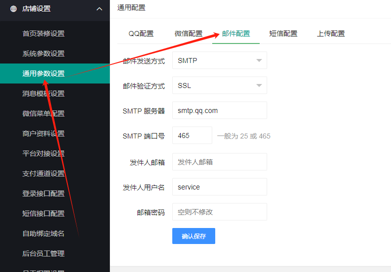 #### 3.网站后台-店铺设置-通用参数设置-邮件配置,QQ邮箱的服务器地址为smtp.qq.com 端口为465