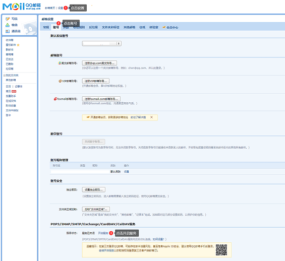#### 1.登录QQ邮箱,点击设置-账号-开启POP3/IMAP/SMTP/Exchange/CardDAV/CalDAV服务即可