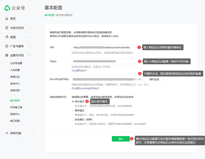 #### 6.进入 设置与开发 - 基本配置-服务器配置-修改配置,填写相关参数后保存提交,提示保存成功即可(注意需要先在网站后台保存好配置,然后再在公众号中提交保存,否则会保存不了,网站后台数据需要与公众号中服务器配置一致)
