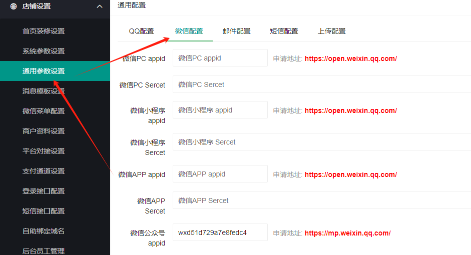 #### 5.进入 网站后台-店铺设置-通用参数设置-微信配置,,填入第三步获取的开发者ID(AppID)和开发者密码(AppSecret),然后设置下方服务器配置后保存数据。