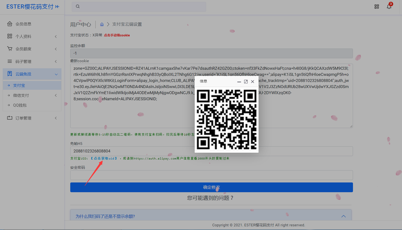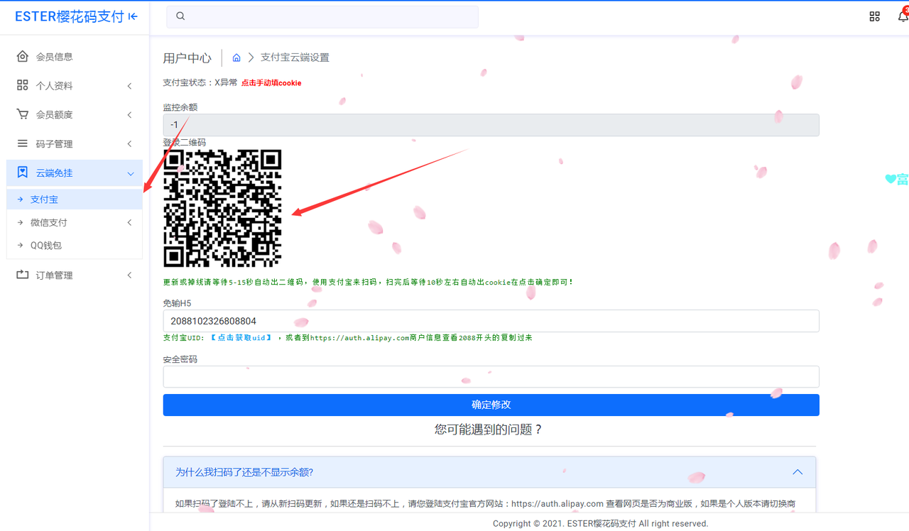 **扫码登录支付宝二维码需要两部手机操作对扫(不可相册识别)或者电脑打开网页手机配合扫码,如果切换为商户版扫码余额还是显示-1,就请变动下自己支付宝的余额在扫码提交即可。**